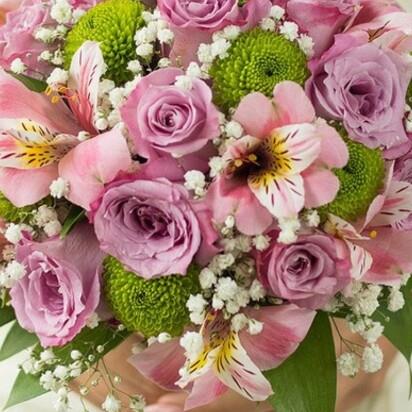 Infuse your wedding day with romance and charm with our beautiful pastel bouquet. This delightful arrangement features soft pink roses, bright green chrysanthemums, and delicate alstroemerias, all accented by lovely sprays of baby's breath and vibrant greenery.