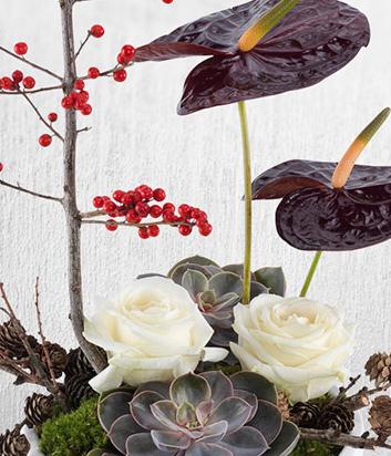 Includes White Roses, Burgundy Anthurium Lilies, Succulent Plant, Ilex Berry, Larch Twig, Bun Moss, White Matt Boule Bowl.