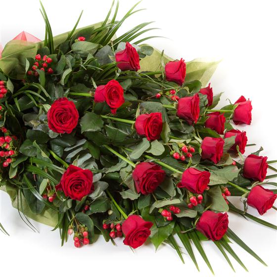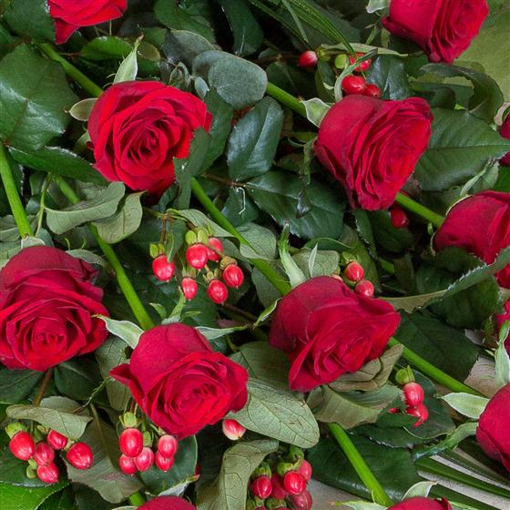 A simple, classic style bouquet of red roses, hypericum berries and unusual foliage. Choose from red, white, pink or yellow roses and either 12, 18 (as pictured) or 24 roses.