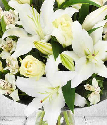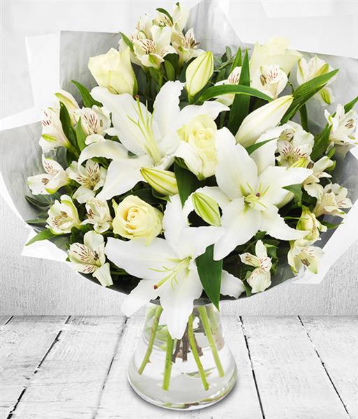 A stunning snowy white fragrant bouquet featuring white Alstroemeria, Roses and Oriental Lilies. With a tree fern flourish, this bouquet really does makes an ideal Christmas gift.