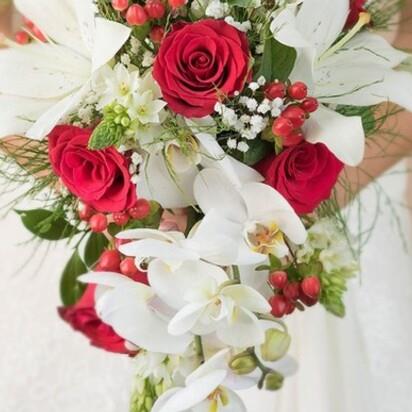 Discover our exquisite bridal bouquet, designed to add a touch of elegance to your special day. This stunning arrangement features a harmonious blend of vibrant red roses, pristine white lilies, and delicate orchids, accented with lush greenery and petite white blossoms.