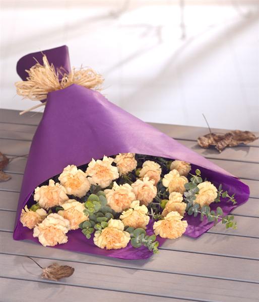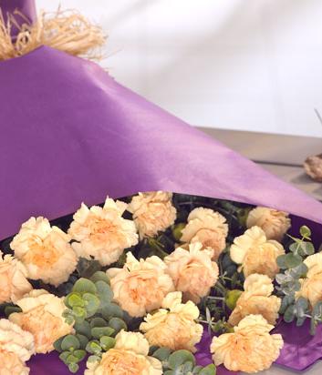 A purple wrap of orange Carnations. A simple yet stunning colour combination.