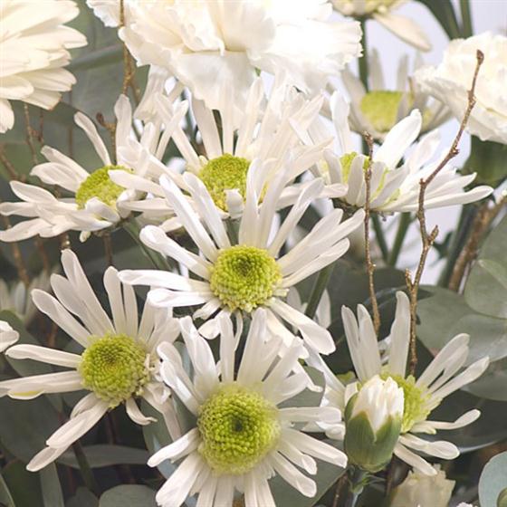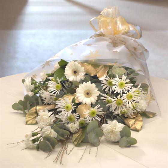 A winter wonderland of crisp white flowers: Germini, Chrysanthemums and Carnations come together to form a classic Christmas flower combination.